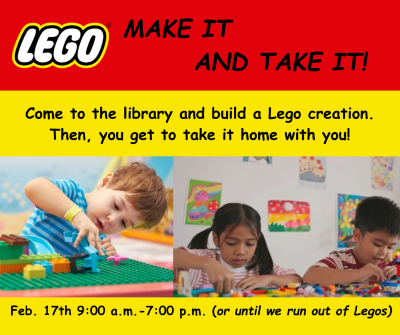 Come create with our excess Legos. Whatever you build can go home with you!