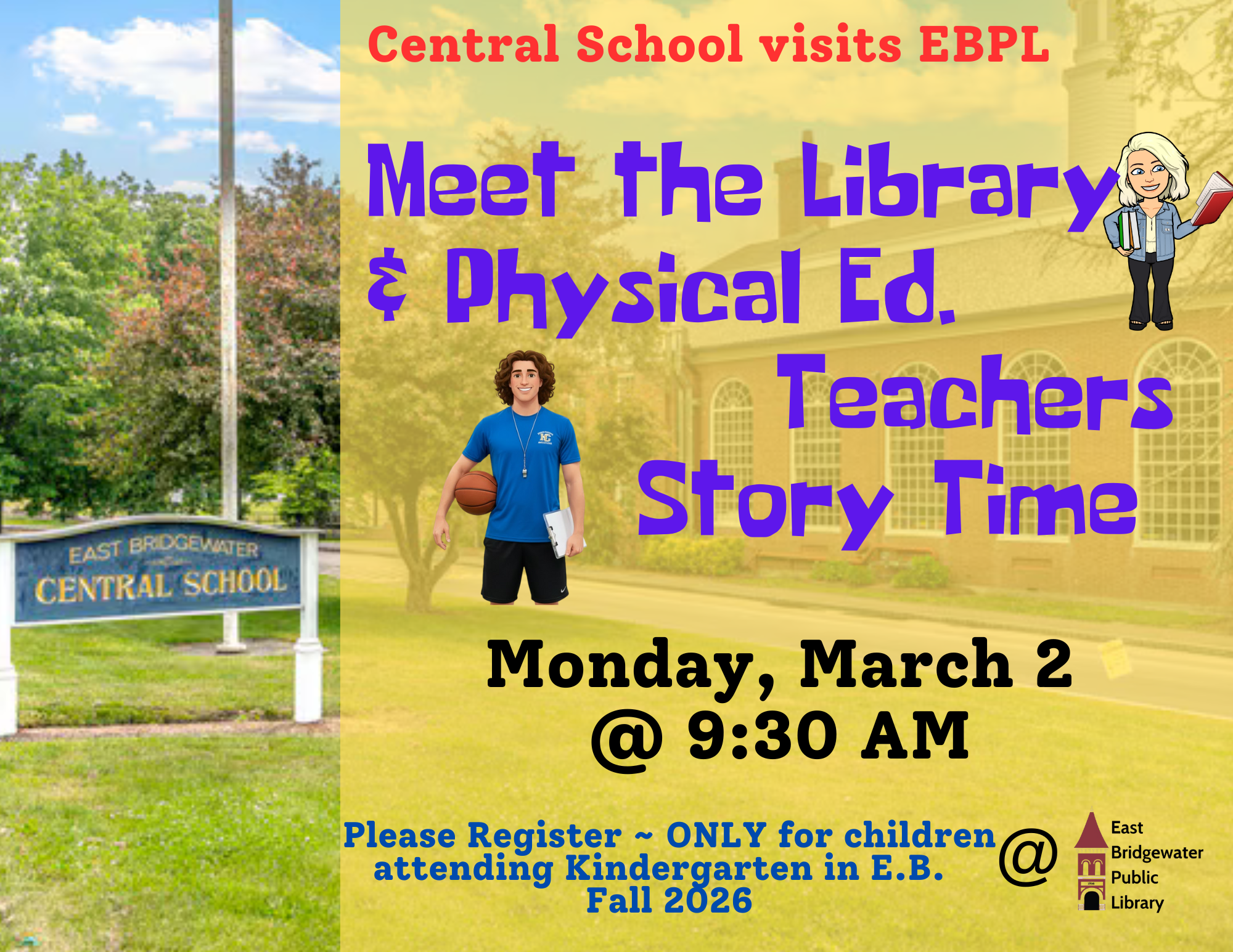 We welcome all incoming Central School Kindergartners to the library to meet next year's teachers. In March, the librarian and Physical Education teacher will be here to do a fun, active story time. Please register ahead of time. Siblings welcome.