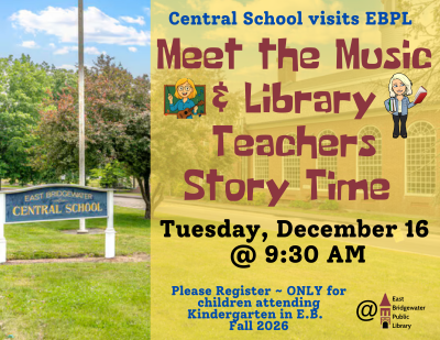 We welcome all incoming Central School Kindergartners to the library to meet next year's teachers. This month the librarian and music teacher will be here to do a fun, festive story time. Please register ahead of time. Siblings welcome.